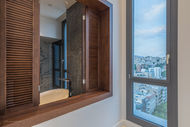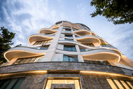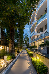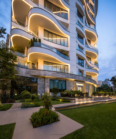 The undulating facade creates pockets of space, providing up to 800 sqft of outdoor space overlooking the garden and the clubhouse next door. The penthouse features an 8000 sqft unit with a 24ft ceiling over the living room, framing gorgeous views of the mountains and the city.